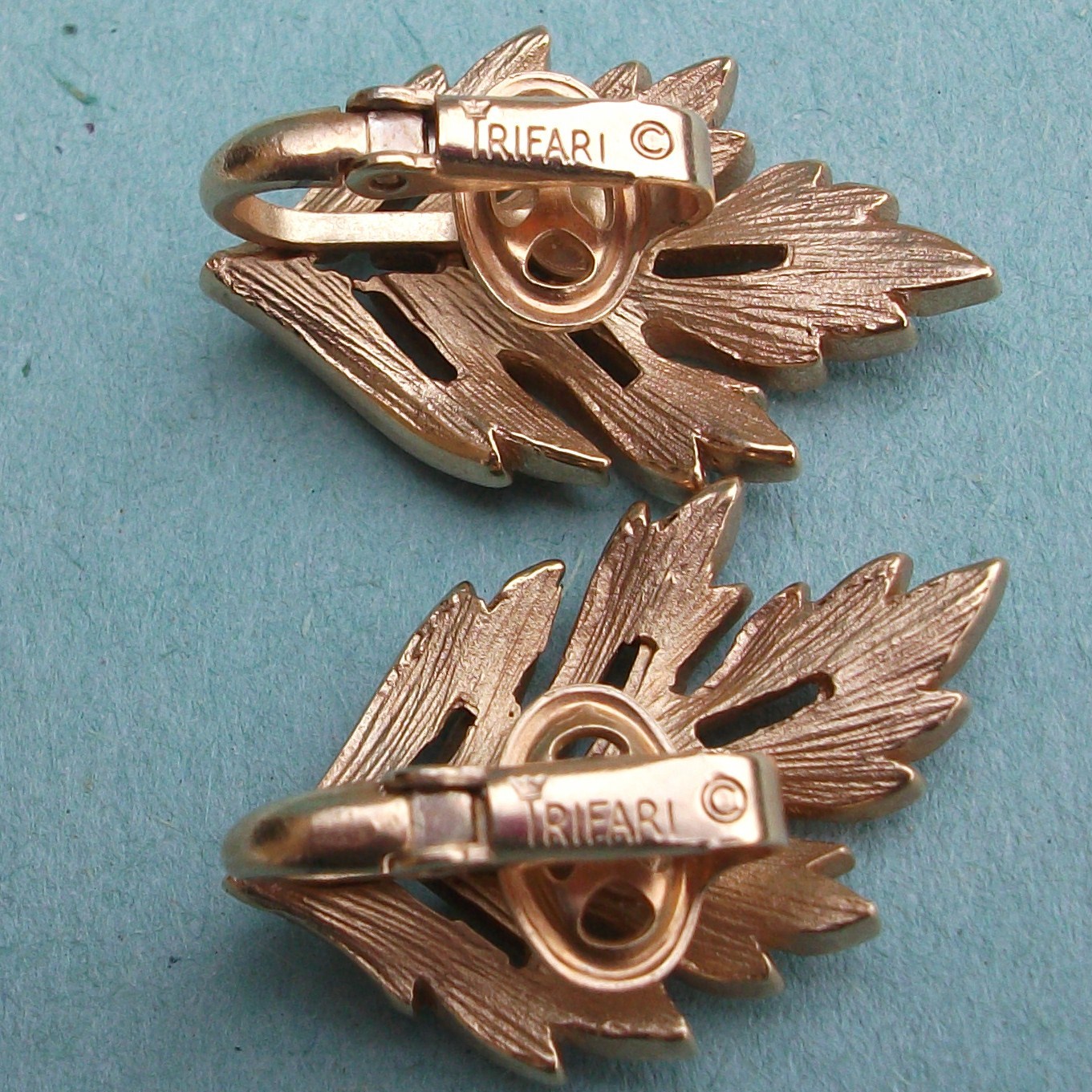 A very elegant pair of Crown Trifari vintage clip on earrings. Gold plated, matte gold leaf design with a shiny border trim for contrast.