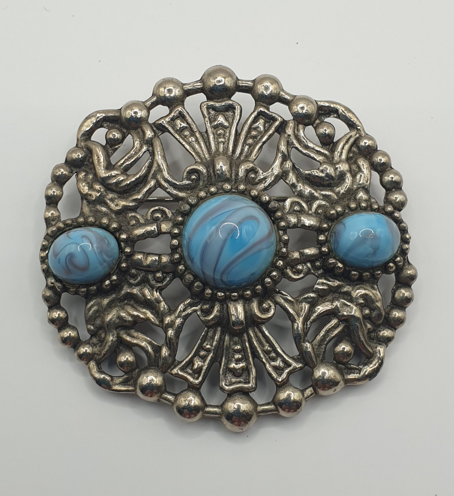 This is a matching Brooch to the necklace selling separately. This piece is equally stunning. Made in England by Jewelcraft Creations for Coro America Brooch - 2" - 5cm. Roll clasp open filigree silver tone with a round stone center turquoise and pink swirls - faux turquoise. EXCELLENT condition. Jewelcraft Creations with the Pegasus horse was a logo and name made in England for Coro America. All the jewellery on my web page is Vintage. Between 90yrs and 40yrs old. 1930s - 1980s respectively. photographs are in close-up to show any wear. please inspect them closely. None of the jewellery has been cleaned so photographs may show accumulated dust possibly from when it was manufactured. Excellent - No indication of handling or marks. Very good - Very minor evidence of handling with no major flaws or wear. Good - moderate evidence of wear, visible scratches and marks. OK - metal back of piece is very worn but front is fine. All jewellery pieces will reflect condition in pricing.