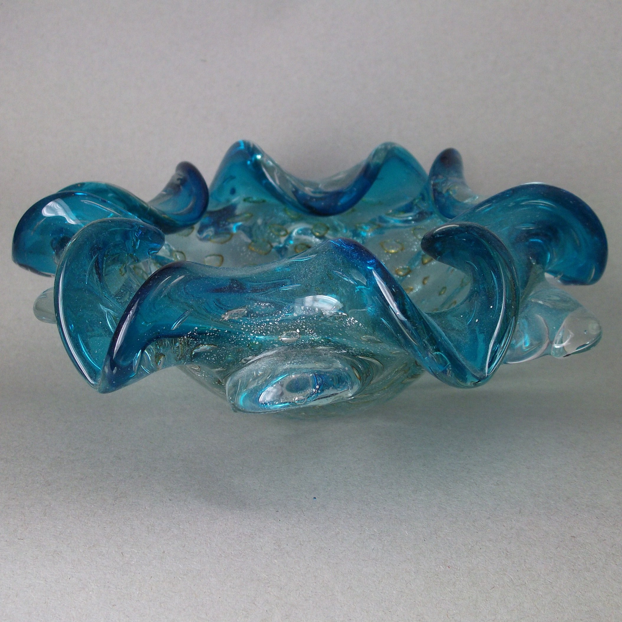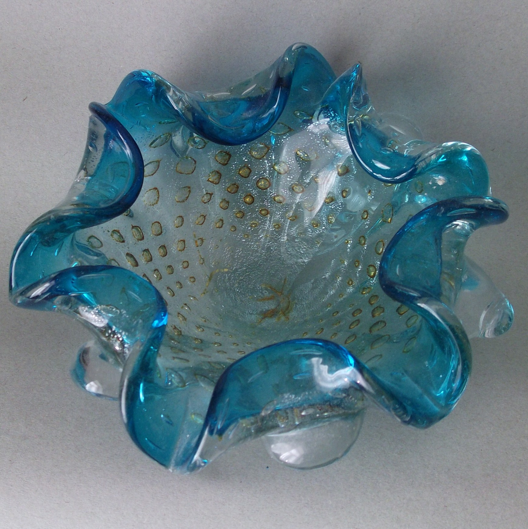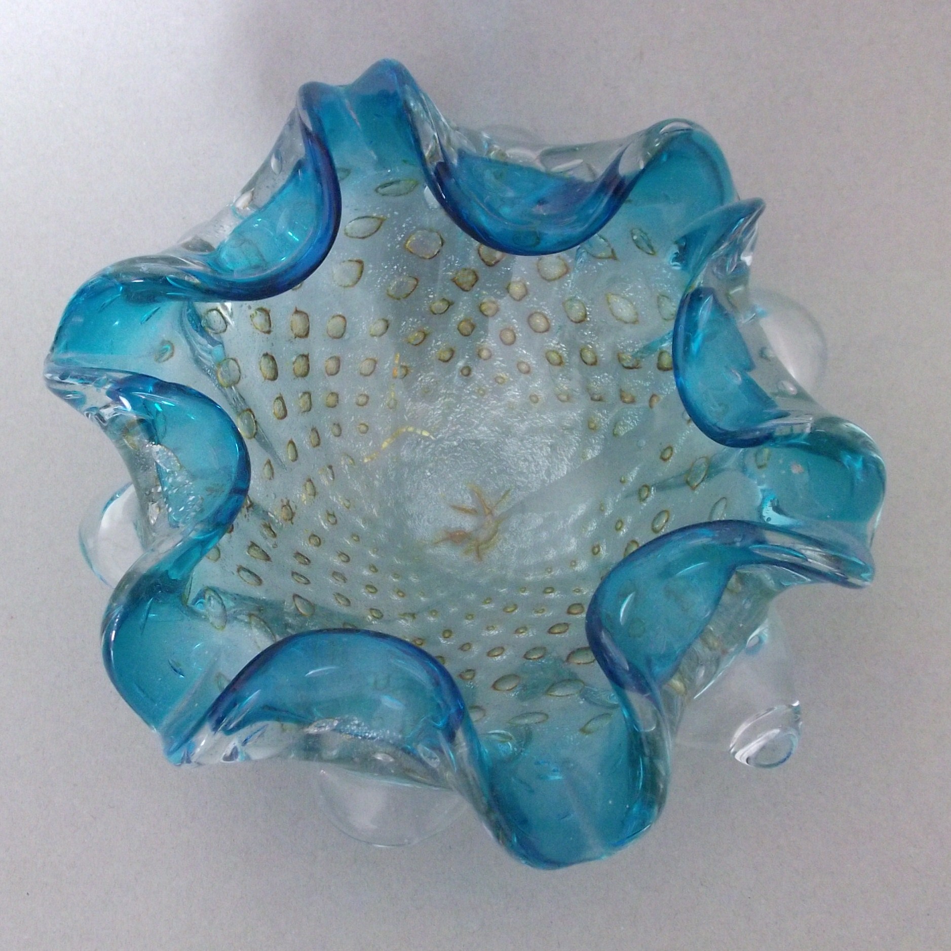 A biomorphic hand crafted Murano Art Glass bowl, with deep turnover folds and thick loop pulls,in a beautiful turquoise and clear glass with gold leaf inclusions. The polished pontil defines its quality.
